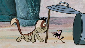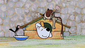 Rex and the cat are friends. Unfortunately, the cat wants to hunt the bird – a friend of Rex. In order to prevent that, the dog and the bird prepare some traps for the cat, they use a bucket of cold water and a rubbish bin.