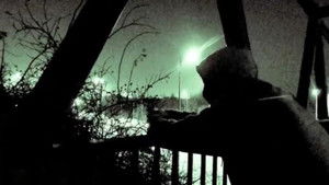 In the eerie stillness of the woods, a hooded figure senses an unseen presence lurking in the shadows.