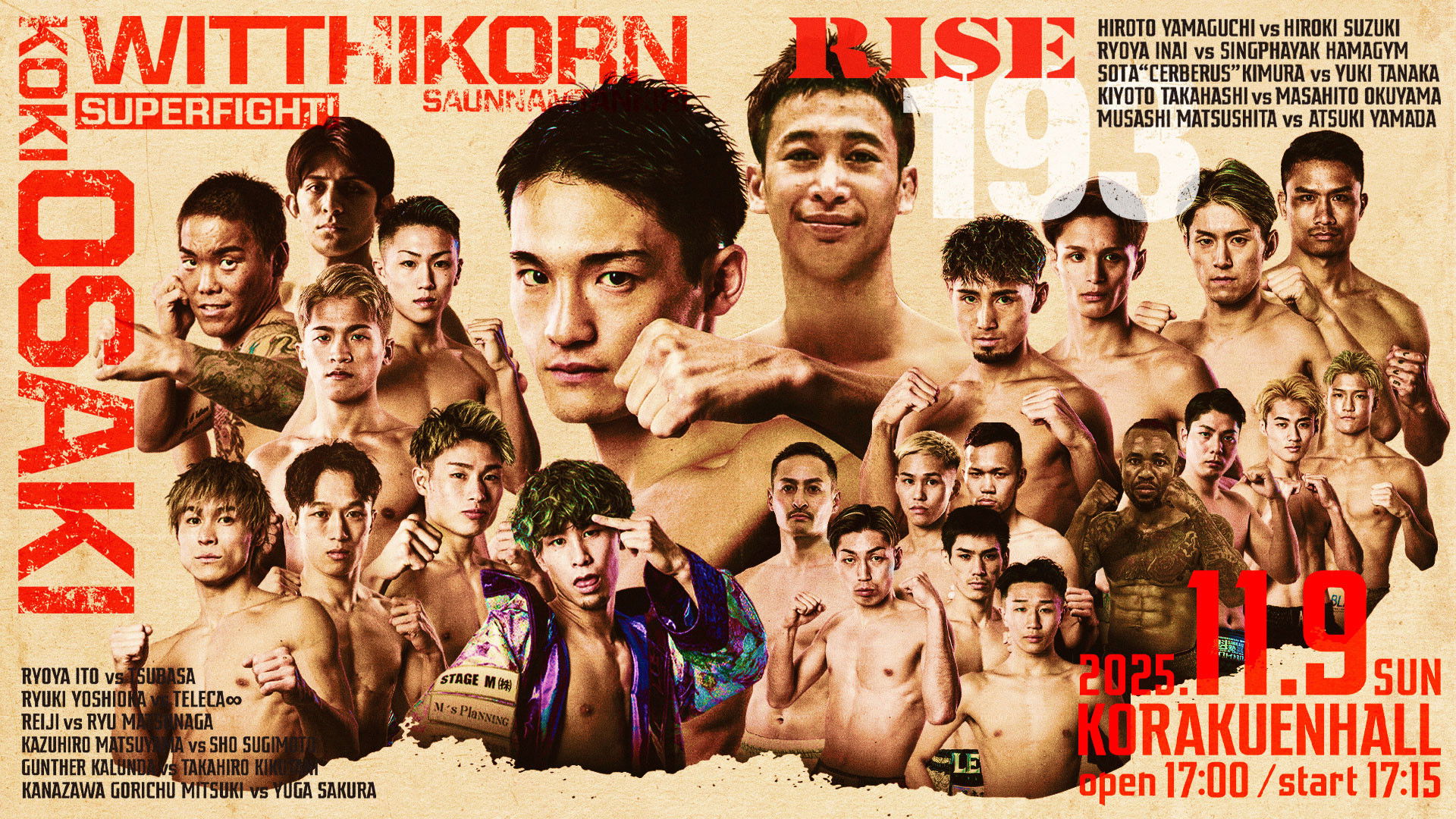 RISE 193 features 12 kickboxing bouts headlined by champion Koki Osaki defending against Witthikorn Saunnamtankiri in a 55.5kg SuperFight, plus ranked clashes like Sota Kimura vs. Yuki Tanaka.