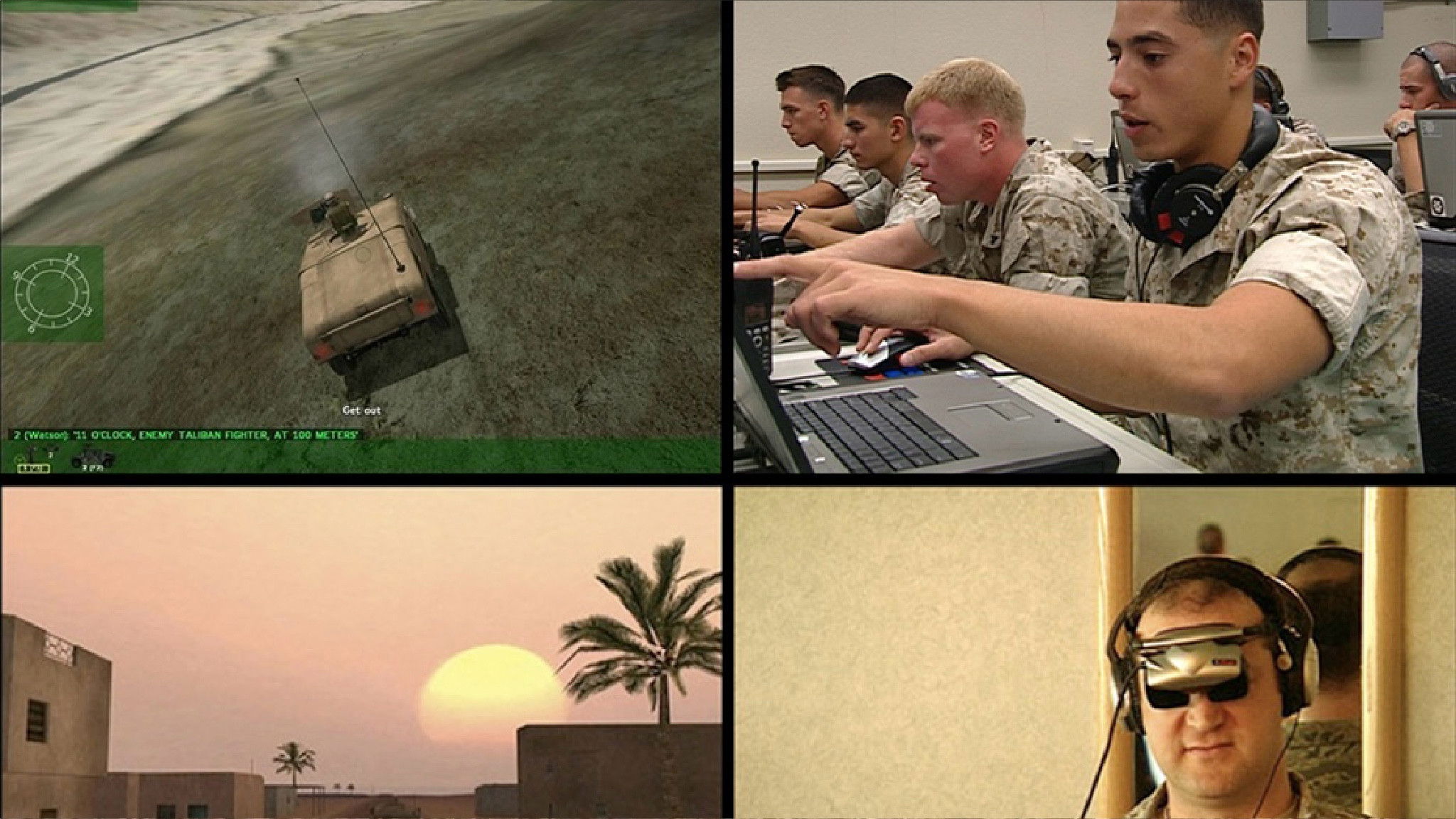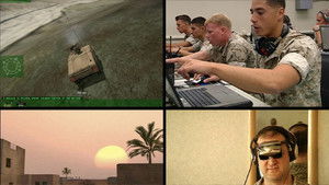 Harun Farocki: Serious Games I–IV (2009–10) explores the use of virtual reality and gaming technology in U.S. military recruitment, training and after-action therapy, revealing fundamental links between technology and violence in a time of war. Young recruits engage in simulated combat training, which barely differs from video games produced as entertainment. Footage is included from a workshop demonstrating the use of computer re-enactments in the psychological care of veterans suffering from post-traumatic stress disorder. As a large-scale installation, Serious Games critically focuses on the role of audiovisual culture in the spectacle of war.