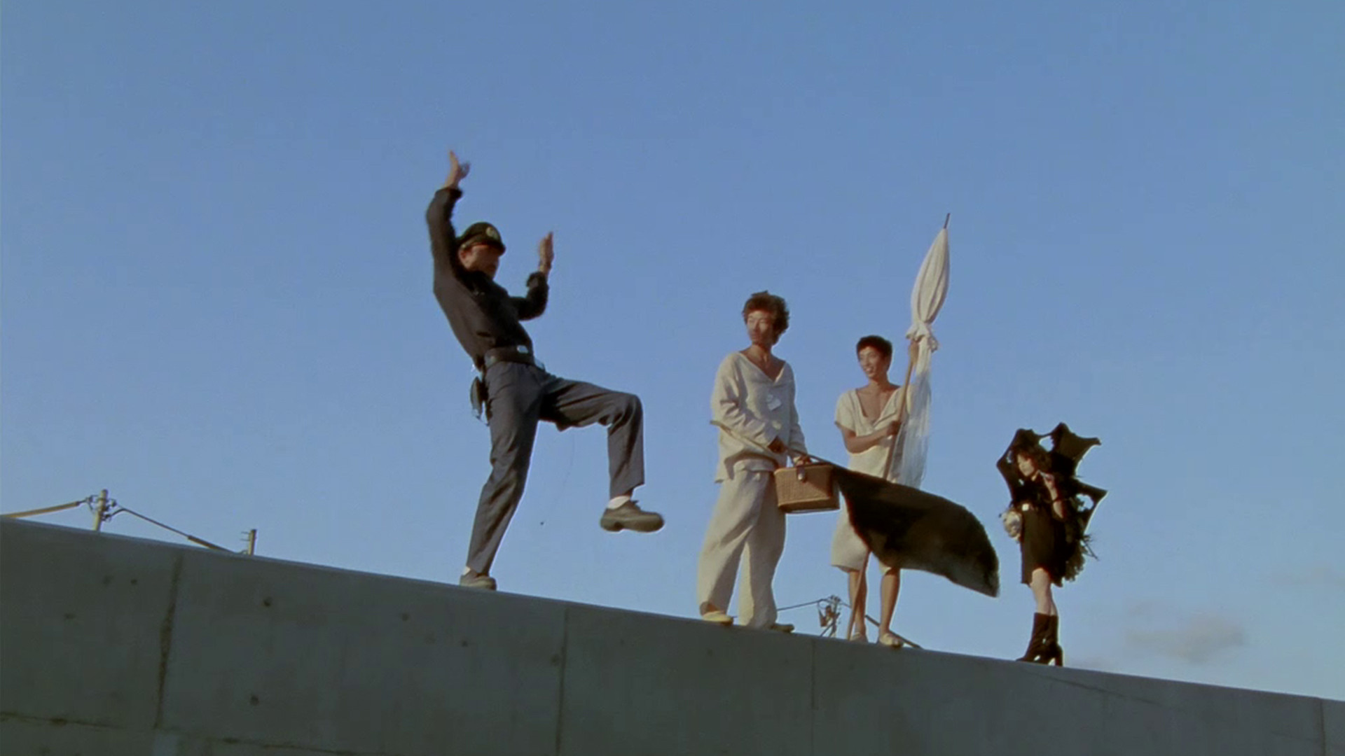 Believing that the world will end that very day, three mental patients Coco, Tsumuji, and Satoru set out upon a journey. Walking upon the tops of the walls of the city, they seek to find a picnic spot with the best vantage point to view the final event.