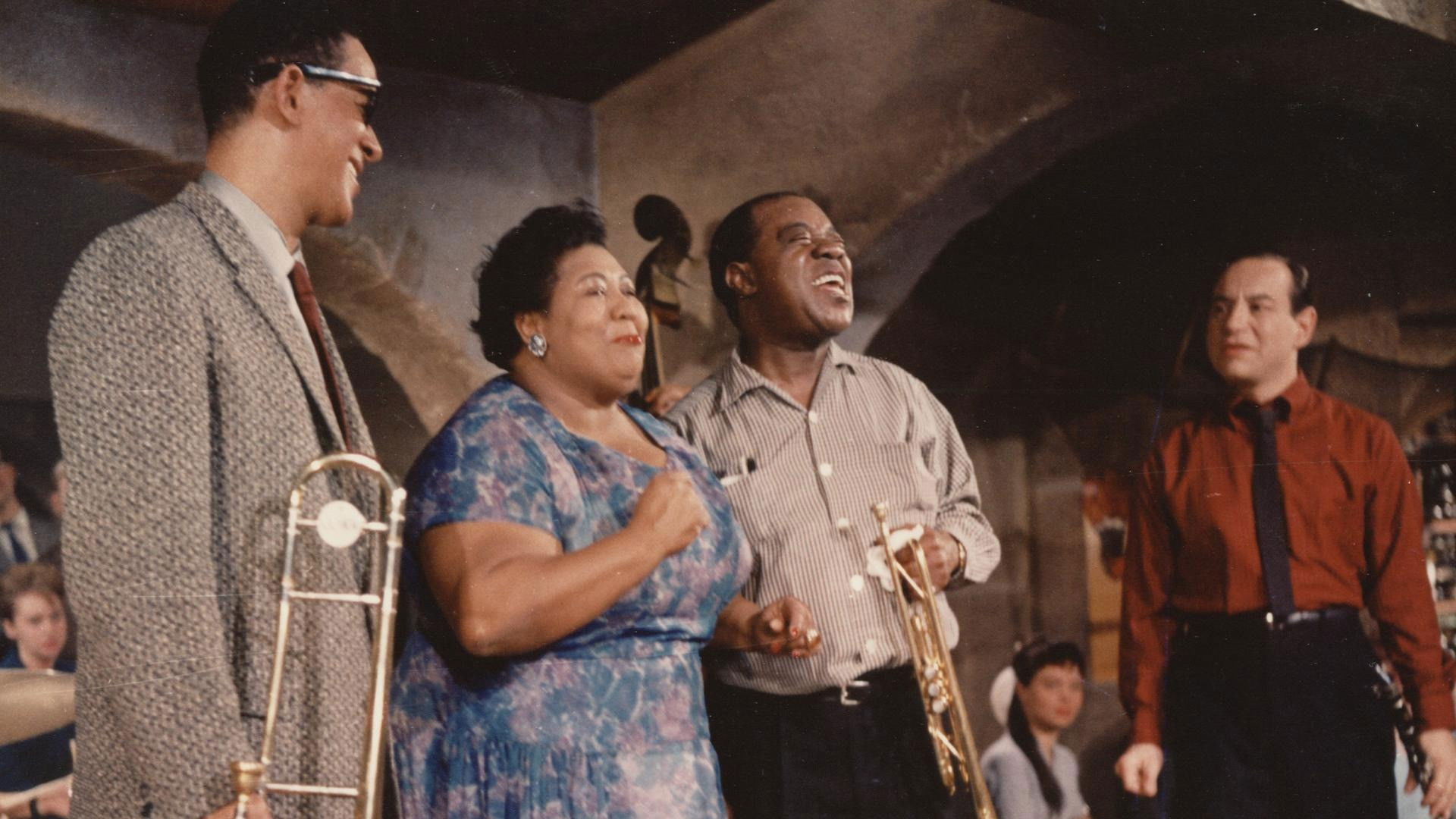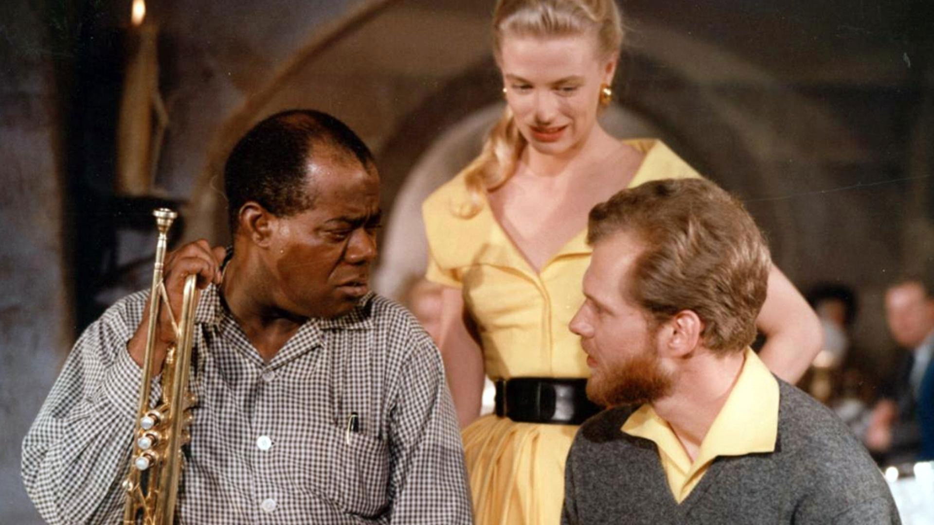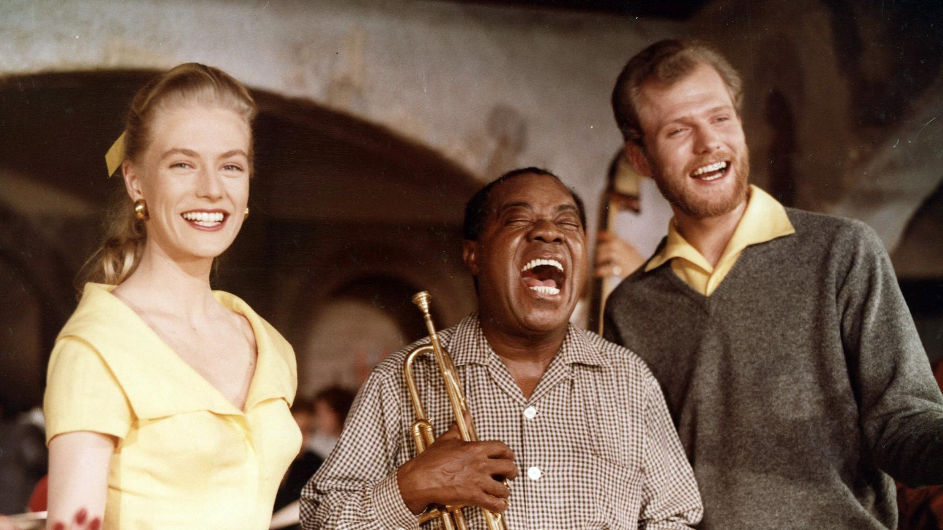Nina and Frederik were the big names in international showbiz in the 1950s with their rousing calypso rhythms. That's why "Kærlighedens Melodi" (The Melody of Love) was bound to be a hit when the young, beautiful couple teamed up with the legendary, wonderful "Satchmo," Louis Armstrong, from the world of jazz. Musical interests vary widely in the affluent neighborhood of Hellerup. At the Schmidt wine merchant's, son Peter has only one interest: jazz. At the Supreme Court lawyer's house next door, Mozart is on the program. But his daughters like both jazz and Peter! Even though their fathers are suing each other, the two young people still find each other. And Louis helps when he plays "The Formula for Love."