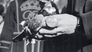 War Pigeon invokes the use of trained pigeons as aerial photographers during World War II. In this phone call to the customer service department of a bank, the speaker describes an unnerving encounter with a suspicious bird, which has led him to question his trust in the bank’s very existence.