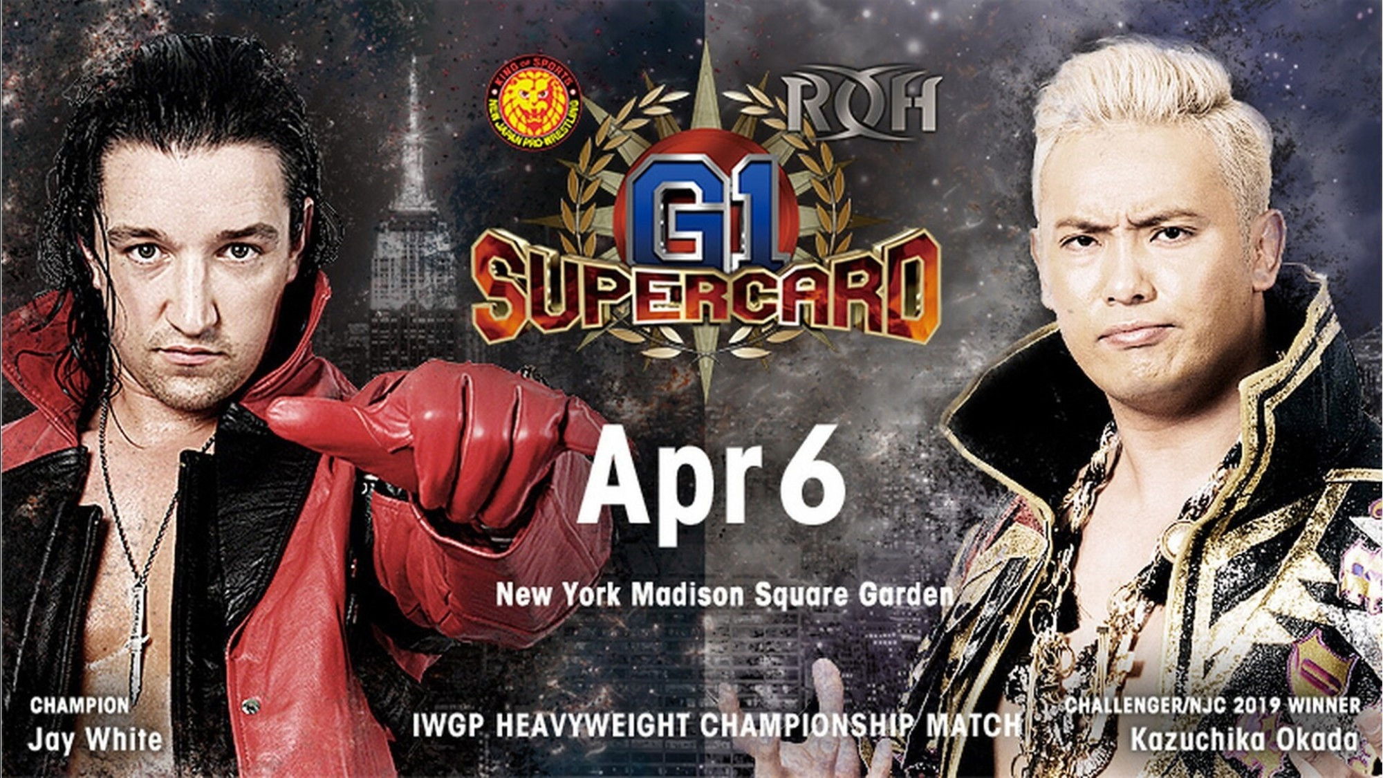 G1 Supercard 2019 was a professional wrestling event co-promoted by Ring of Honor (ROH) and New Japan Pro-Wrestling (NJPW) that took place on April 6, 2019, at Madison Square Garden in New York City, and was headlined by Jay White (c) vs. Kazuchika Okada for the IWGP Heavyweight Championship.
