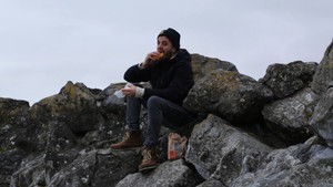 A man is eating McDonald's burger on a beach populated by penguins and sea lions. Suddenly a sea lion begins raping a penguin. The man quickly finishes his cheeseburger before intervening.