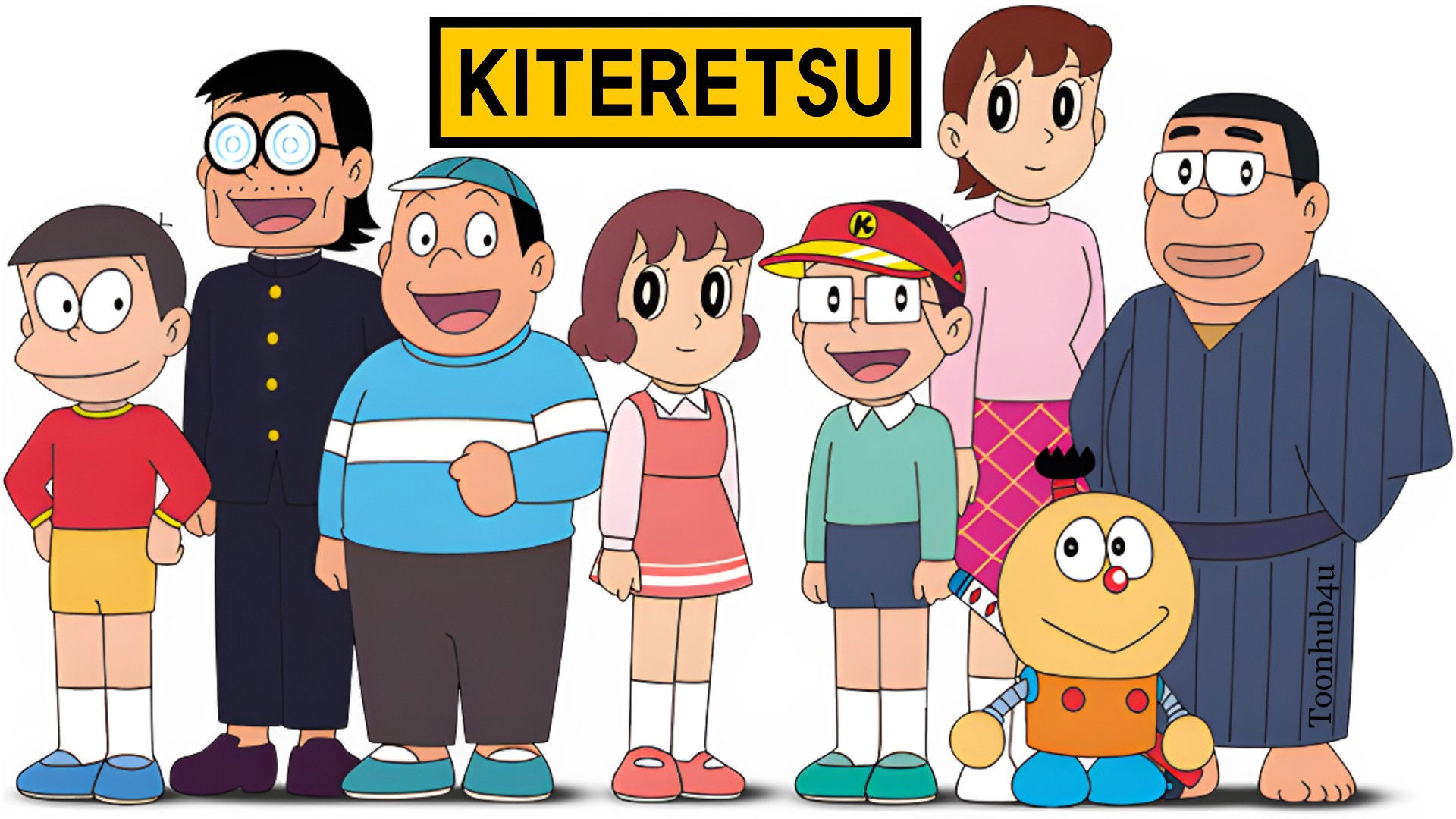 The main character is a scientific genius boy named Kiteretsu, who has built a companion robot named Korosuke. He frequently travels in time with his friends and Korosuke in the time machine he built. Miyoko is a girl in his neighborhood who is basically his girlfriend. Tongari is his rival, who happen to share some similar traits of Honekawa Suneo. Buta Gorilla is a typical neighborhood bully, who also share similar traits of Gian except that he often antagonizes Korosuke (though they are in grade school).